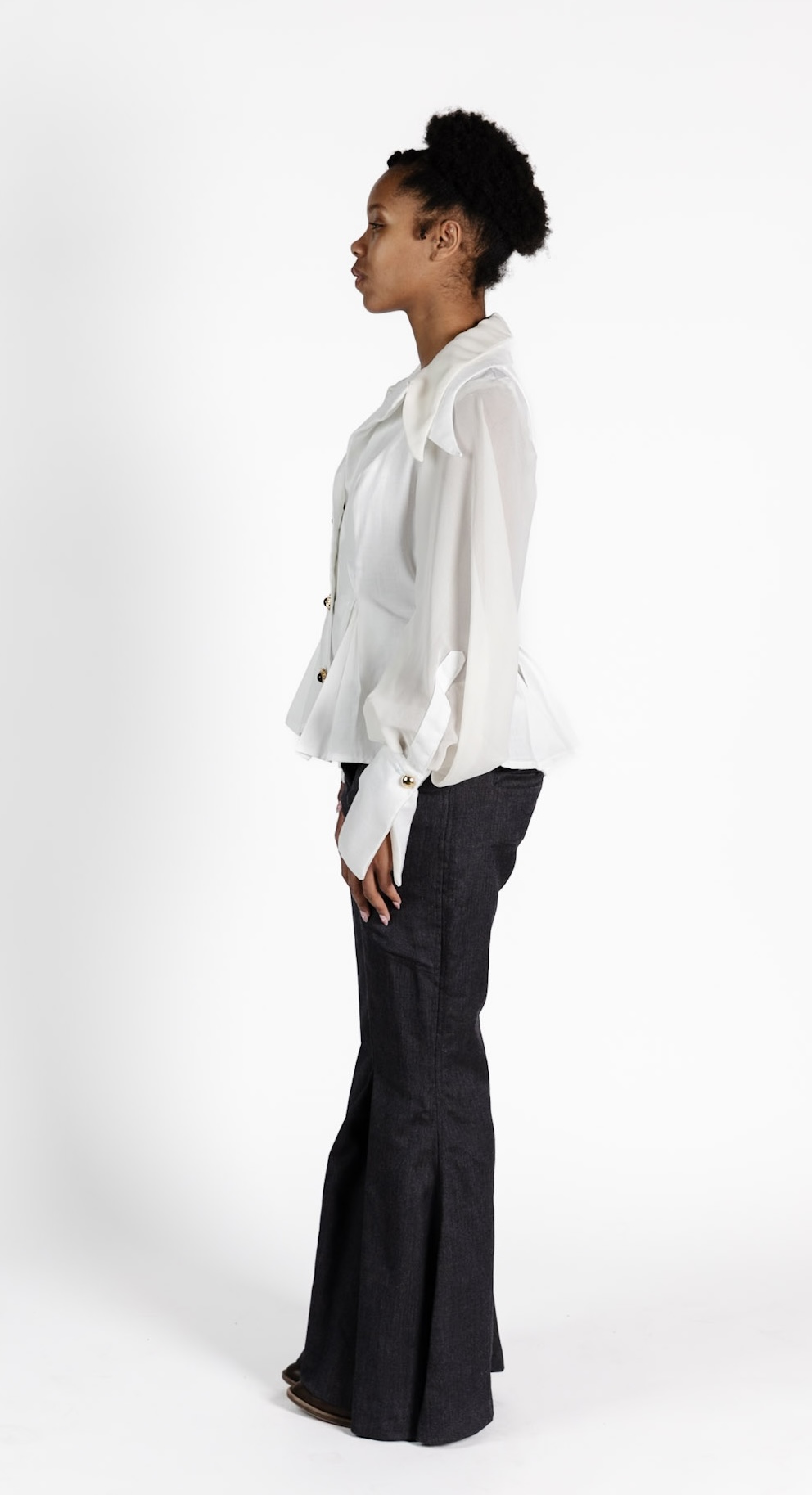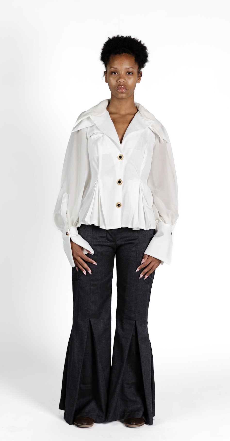 These garments were inspired by Christian Dior’s iconic Bar suit from 1947, and the elegance of Art Deco design. Created for my Patternmaking II class, the project focused on construction, leading me to Dior, whose background in architecture shaped his sculptural approach to fashion. I drew influence from the Bar suit's structured silhouette and reimagined it through an Art Deco lens. Box pleats added controlled volume, while exaggerated sleeves, layered collars, and extended cuffs introduced softness and drama. For the pants, I referenced 1920s menswear, designing a voluminous silhouette with classic pleats to complement the tailored, architectural quality of the top.