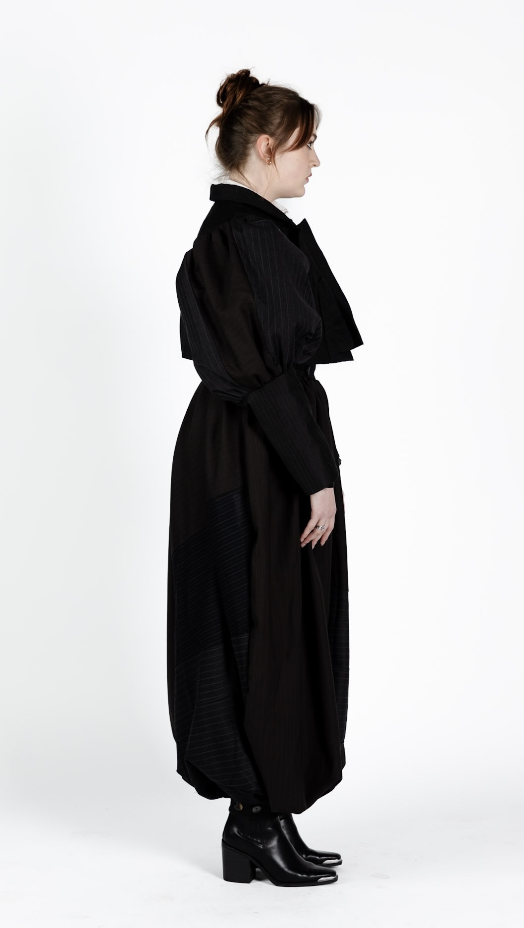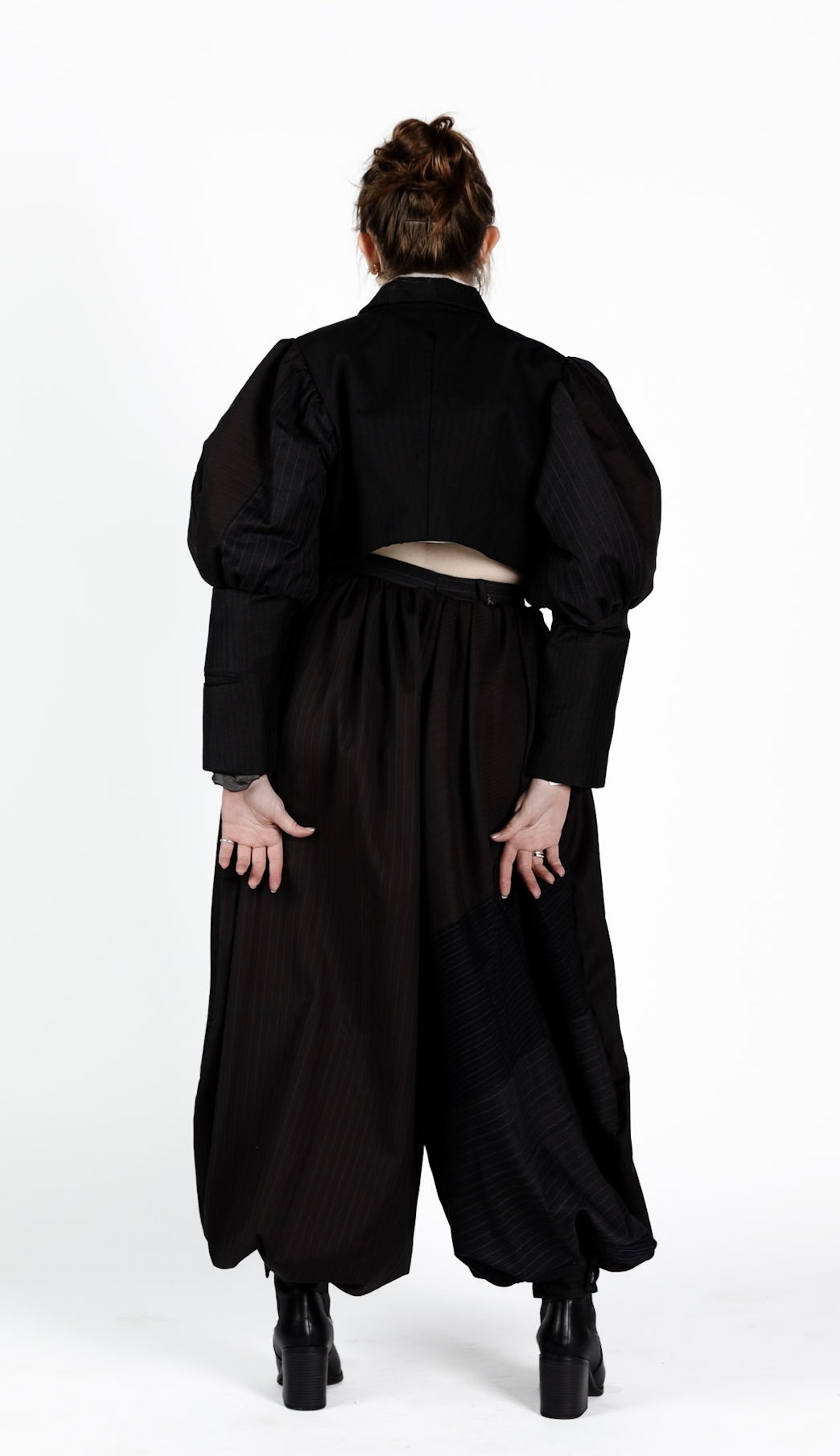 Maneuvering in a fashion space and knowing the environmental impact of the fashion industry raises many points of curiosity for my design practice. How can I as an individual contribute to positive environmental change? This line of thinking often leaves me grappling with function versus beauty and the intersections between the two. What is the point of clothing with no function, and what is the point of artistic expression with no beauty? In my design style, I lean towards what I would call 'functional eccentricity,' invoking joy and wonder through diligent and well-executed design, taking into account how the human body and the garment change with age and how the garment can move with its wearer throughout its lifetime. I do this by making the garment as adaptable and multifunctional as possible ensuring that it can get as much use as possible.